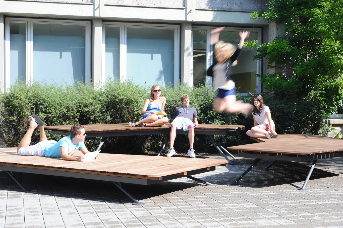 die collageartigen holzdecks werden an dieser schule für unterschiedliche situationen genutzt – sie sind chilloutzone, freiarbeitsplattform und bühne für schulaktionen